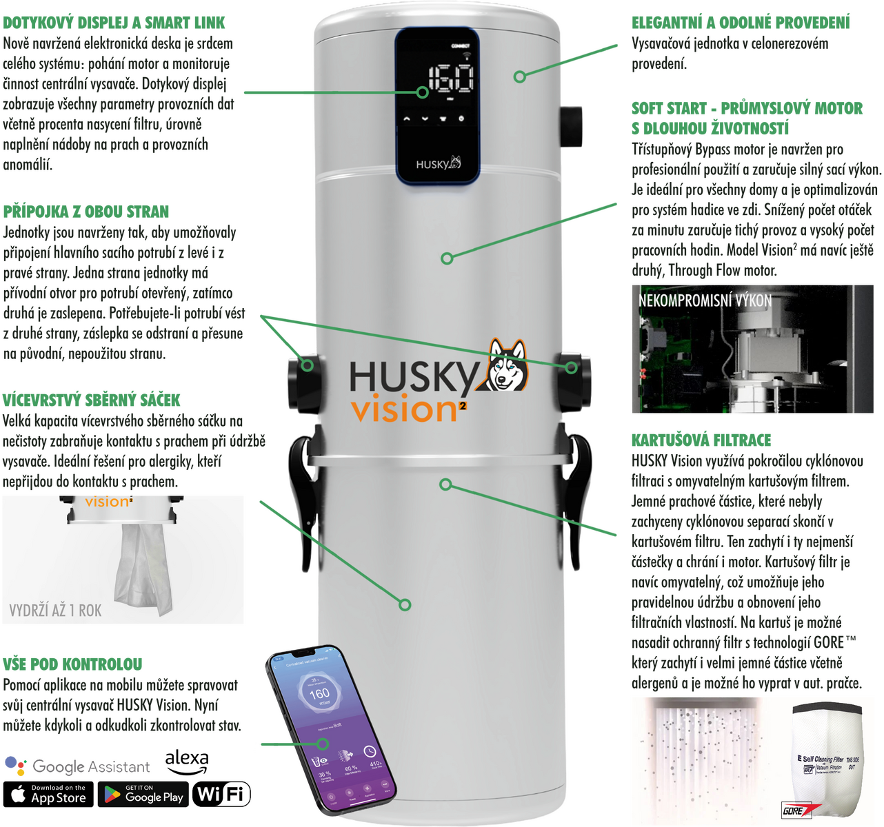 V rámci akce vám doporučujeme generační výměnu za již zmíněný, špičkový model centrálního vysavače HUSKY Vision, ale samozřejmostí je i případná výměna za další modely HUSKY, jako jsou vysavačové agregáty HUSKY Air 200, Air 300, Pro 100, Pro 200, Evo2, Titan2 a Air Hepa.